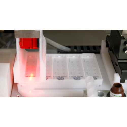 - Reliability and traceability due to automatic identification of the barcodes on patient samples and slides